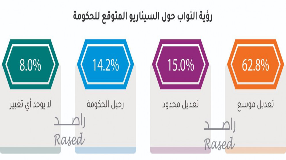 The results showed that 14.2 percent of the parliamentarians believe that the government is leaving, while 85.8 percent of the parliamentarians believe that the government will remain, as 62.8 percent of the parliamentarians believe that an extensive amendment will be made to the government, while 15 percent believe that a limited amendment will be made. The government, and 8% believe that there will be no amendment or change to the government, while 14.2% of MPs believe that the government is leaving.