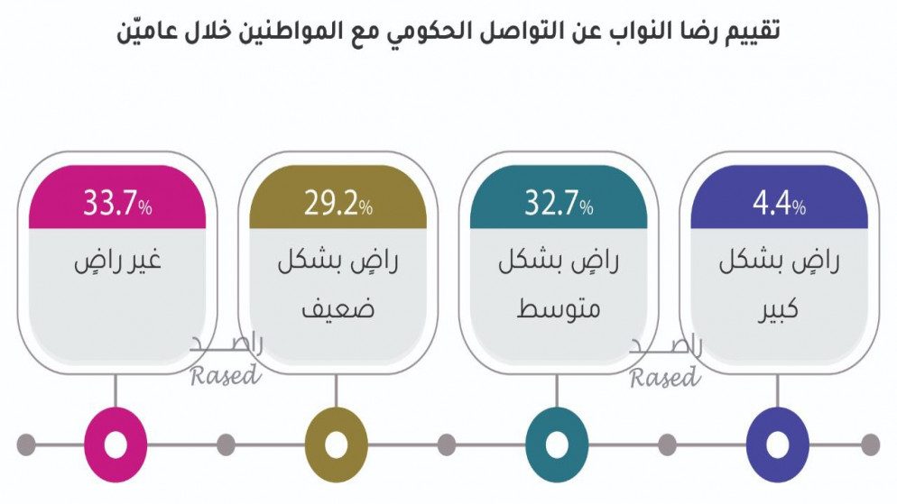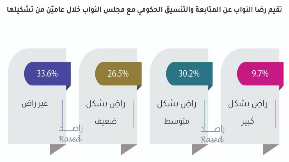 On the MPs’ satisfaction with the governmental follow-up and coordination with the House of Representatives during two years, 9.7% of the MPs said that they were highly satisfied, 30.2% were moderately satisfied, and 26.5 percent of the MPs said they were weakly satisfied, while the percentage of MPs was dissatisfied. Regarding the extent of government follow-up and coordination, it is 33.6%.