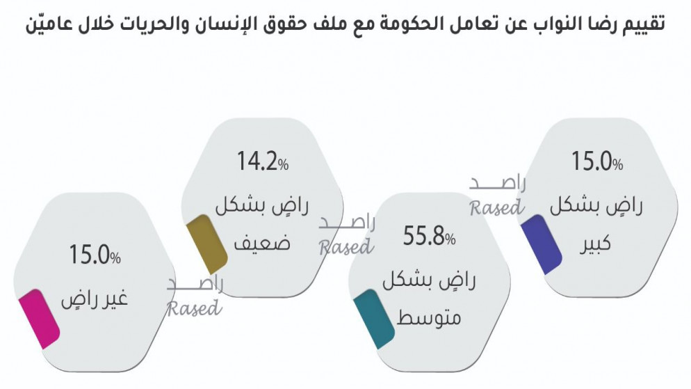 The report included a comprehensive survey of the views of MPs on the performance of the Khasawneh government during two years, where 113 female parliamentarians responded, 3 MPs abstained from answering, and 12 female parliamentarians were not reached, and the parliament speaker and parliament member, Hassan al-Riyati, were excluded.