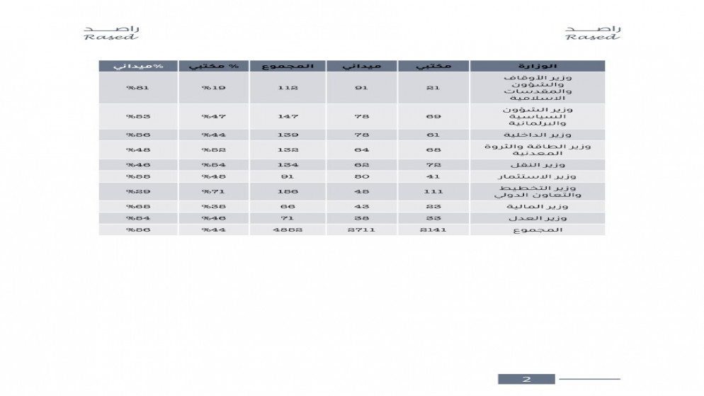 The report preparation team tracked all the activities of members of the Khasawneh government during the two years, as the total field and office activities amounted to 4852 activities, and 134 field activities were monitored for the Prime Minister, and the most ministers implementing field activities were the Minister of Agriculture with 211 field activities, followed by the Minister of Culture with 191 activities In the field, the Minister of Tourism and Antiquities with 178 field activities, the Minister of Local Administration and Political and Parliamentary Affairs with 176 activities, followed by the Minister of Youth with 153 activities, then the Minister of Social Development with 151 activities, noting that the methodology of preparing the report excluded the Minister of Foreign Affairs and Ministers of State from the enumeration of activities, and the report showed The number of trips of members of the Khasawneh government during the period 10/12/2020 until 11/10/2022 amounted to 248 trips.
