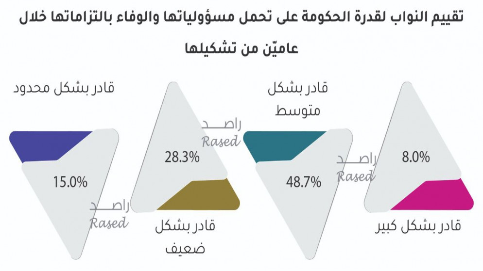 The results showed that 8% of the deputies believe that the ministerial team was able to assume its responsibilities and fulfill its obligations to a great extent, while 48.7% of the deputies believe that it was moderately capable, and the percentage of those who see it as weakly capable, 28.3%, and the percentage of those who see it as weakly capable. They see it was able to a limited 15%.