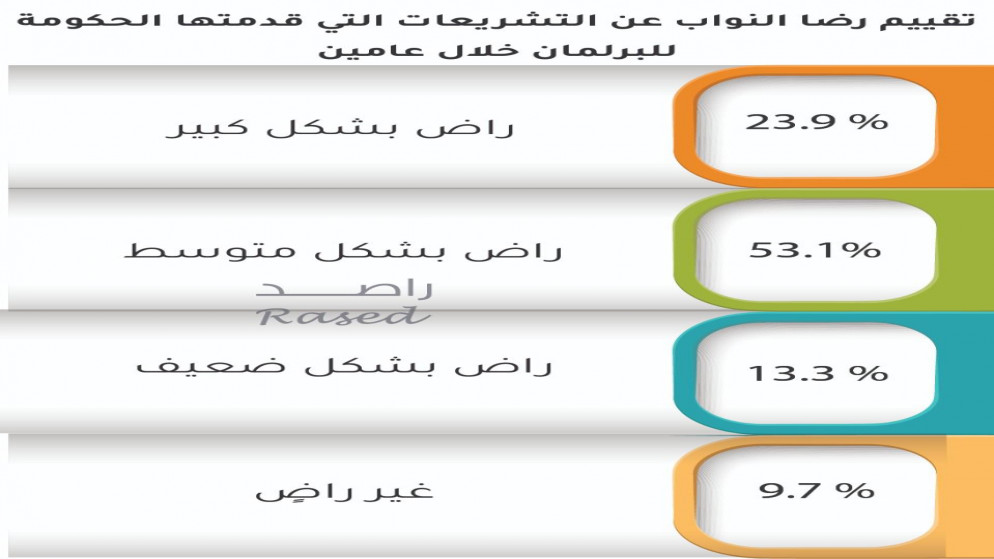 23.9 percent of the MPs said that they are highly satisfied with the legislation presented by the government to Parliament, while the percentage of those who are satisfied was an average of 53.1%, and the percentage of MPs who were weakly satisfied with the legislation presented by the government was 13.3%, while the percentage of those who were dissatisfied was 13.3 percent. 9.7%.